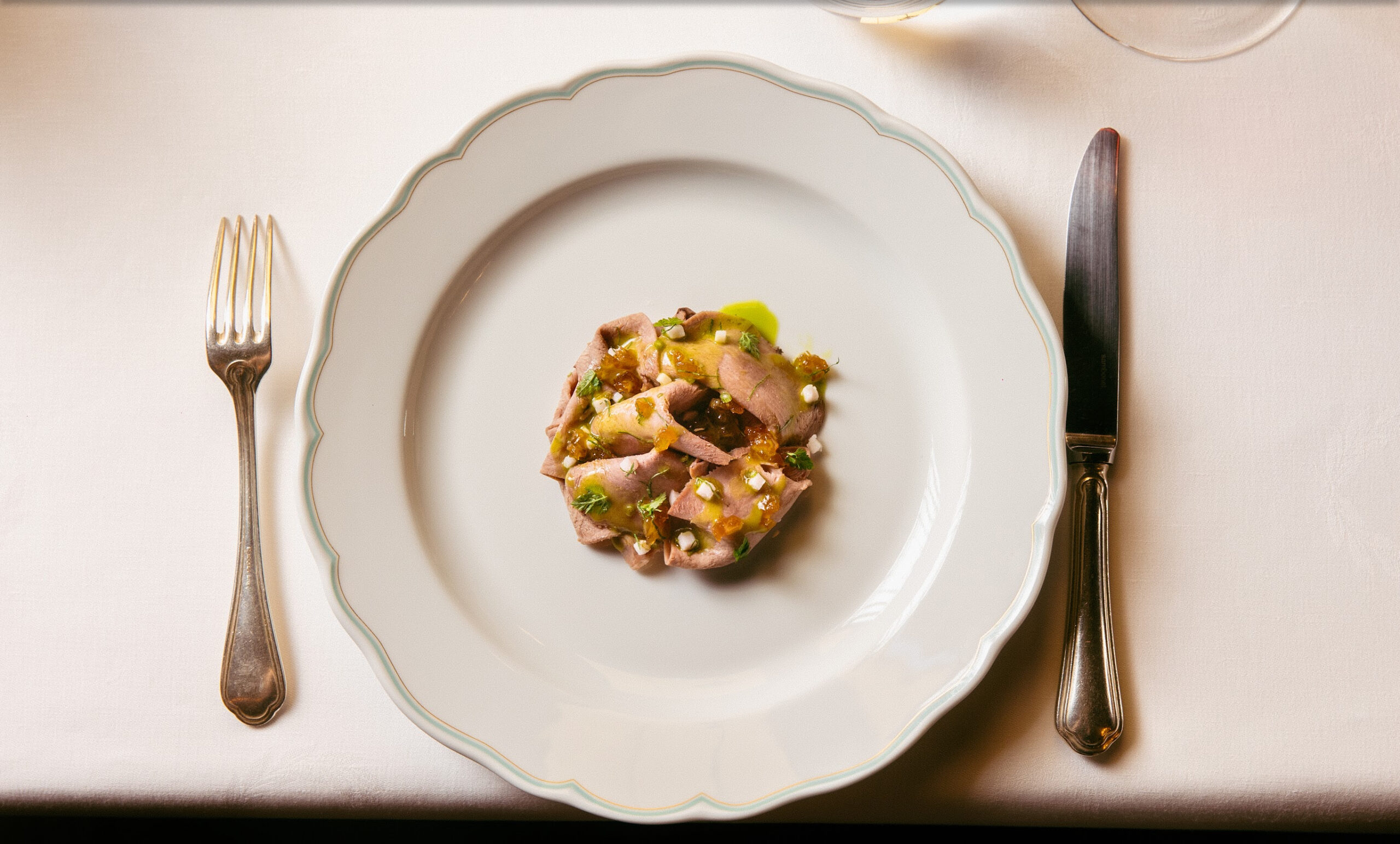 Si ispirano al libro Il cuoco piemontese perfezionato a Parigi i particolari di alcuni piatti del menù come l’Ostrica gratinata con pane alle erbe e scorza di limone, servita nel suo guscio con un fondo di pollo e la deliziosa Lingua alla Persillade, accompagnata da una salsa verde e un concassé di lardo in carpione. Trae ispirazione dallo storico volume anche il Piccione alla Marengo (la ricetta originale era “Piccioni con intingolo di gambari”) dove la salsa è l’incontro intrigante di un fondo di piccione e una bisque di crostacei.